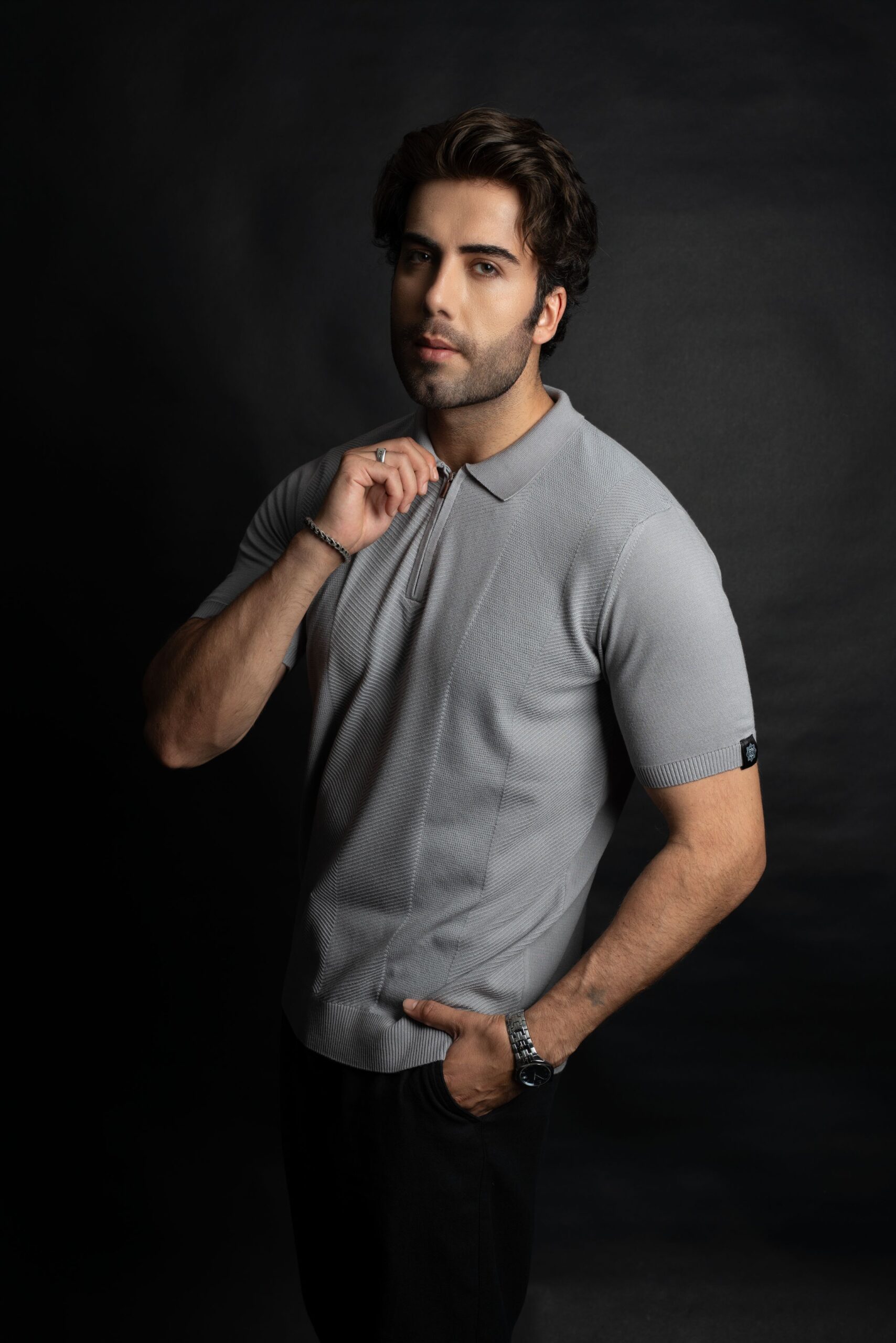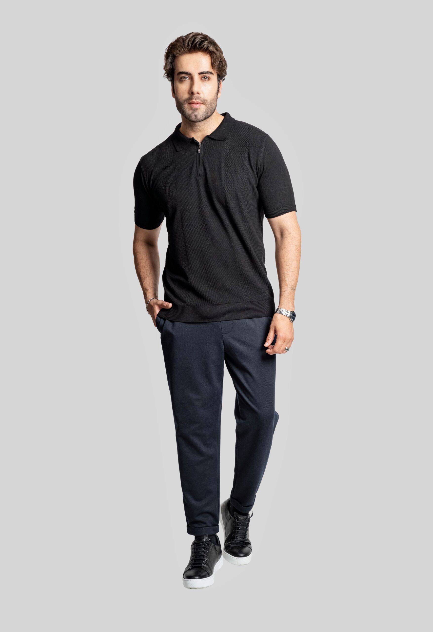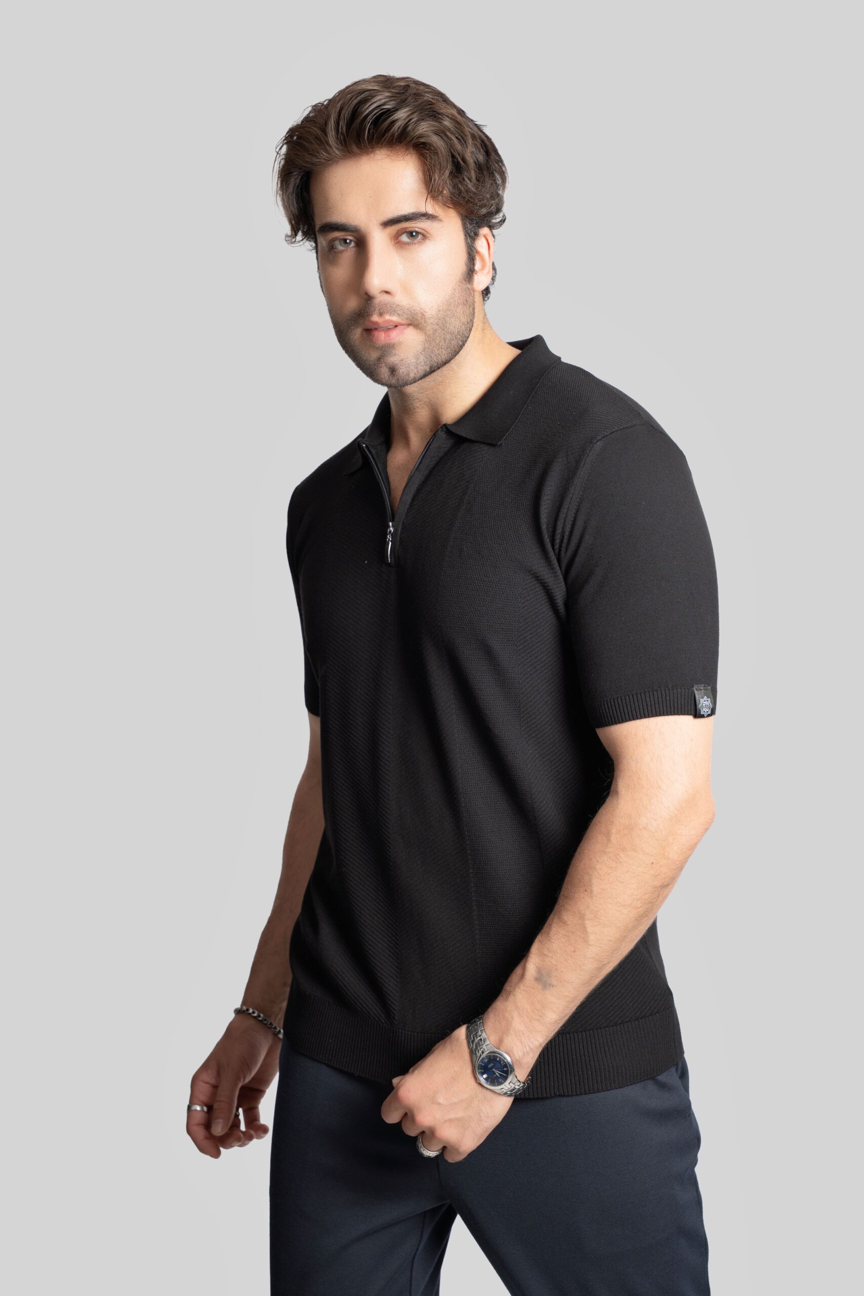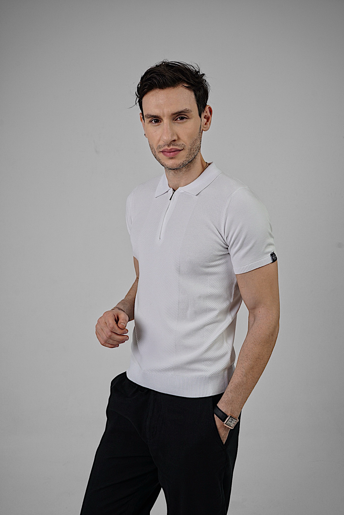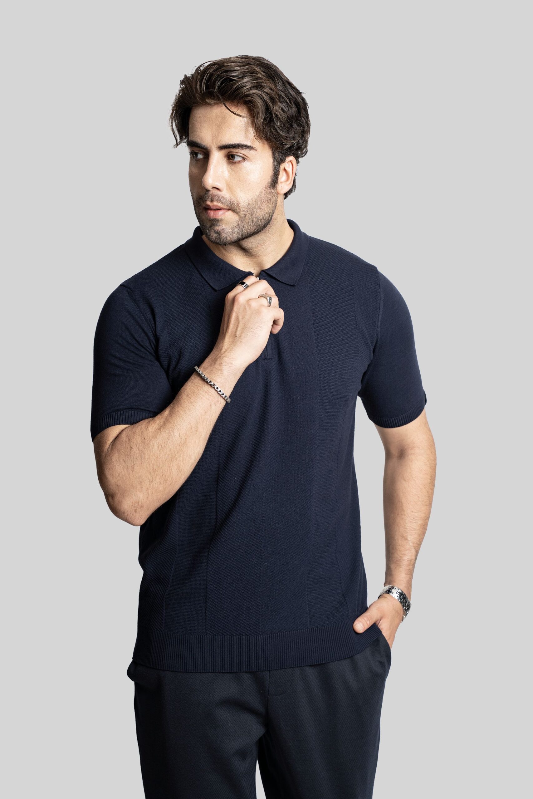• Polo da uomo realizzata in maglia mista pirinç e lavorazione diagonale, dal taglio pulito e contemporaneo.