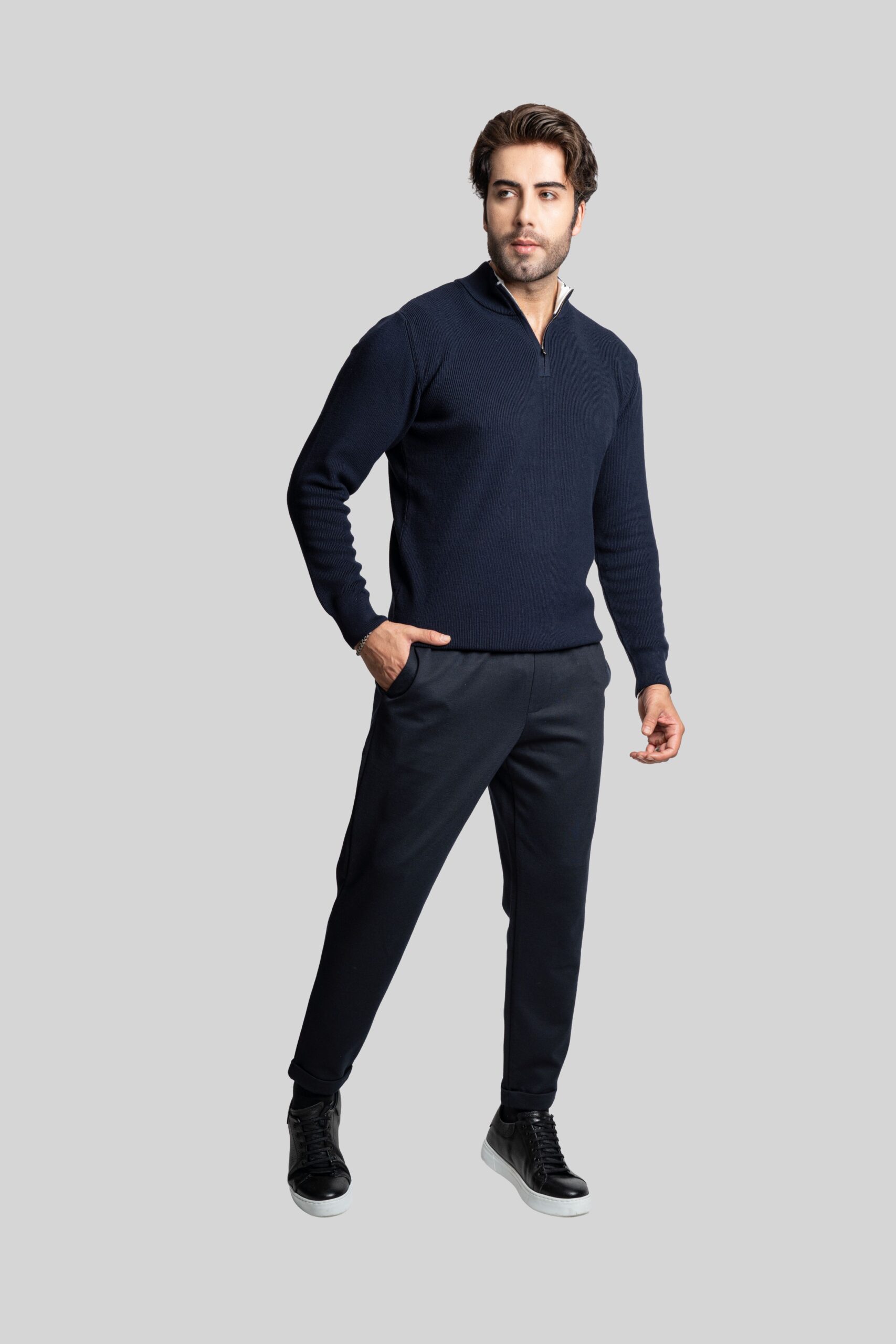 • Il design essenziale in colori sobri è arricchito da una zip frontale corta, che sostituisce la classica abbottonatura, donando un tocco tecnico ed elegante al capo.